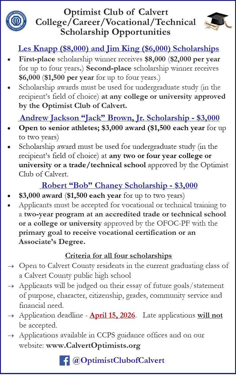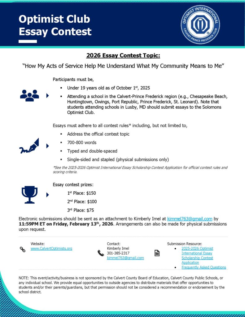 The contest is open to students under age 19 (as of October 1, 2025) who have not yet graduated from high school. To apply through the Optimist Club of Calvert, students must attend a school in Calvert County. The contest flyer with rules and contest application can be found below.
